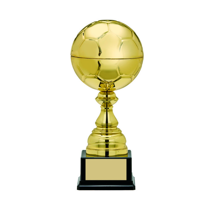 En stilren gullpokal 40 cm høyde med sort sokkel og god plass til inngravering
